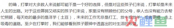 他们当中或许存在天生的格斗选手,已经坚定了自己的格斗梦想,但现实让他们坚持完成九年义务教育,获得更广阔的发展空间。事实上,没有人知道未来会怎样?是非对错可能不是一时可以判断的。