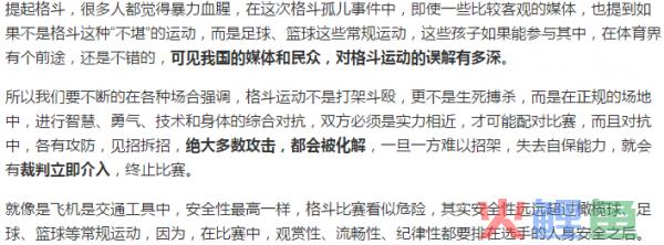 部分网民指出公众似乎普遍对综合格斗存在偏见,这也是引发争议的重要原因。“血腥斗殴”“残酷无情”是综合格斗的刻板印象,实际上“无论国内外,MMA都是正规、安全的职业体育运动,专业运动员的发展大有可为。”