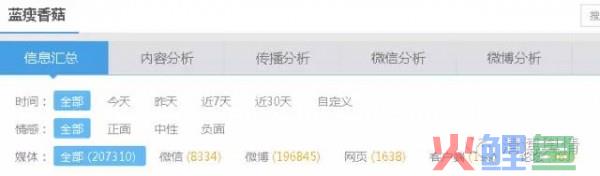 通过清博舆情监测系统(免费、每两周迭代的舆情系统、近30000用户的选择,)监测“蓝瘦香菇”,截至13日下午16时,不足3天的时间,“蓝瘦香菇”的信息总量达到207310条,其中微博数据有196845条,微信数据有8334篇,网页数据有1638条。
