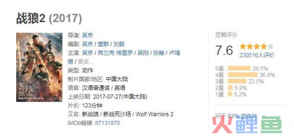 分析完了,《战狼2》的信息流广告传播、公众好评传播、大V微博传播力量对“战狼2”的成功起到了绝大作用,当然,公众的好评传播的根本原因还是在于《战狼2》的作品从制作上引起了群主共鸣,从剧情上以“祖国的力量”激起了民心。
