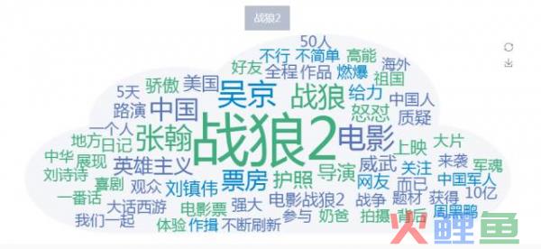 以上是全网关于“战狼2”的文本信息的关键词提取,总计60个,利用自然语义分析法,对战狼2的人物、事件、品牌、地域中所提及的关键词进行分词聚合,呈现出被提及次数最多的关键词,主要来源信息媒体报道、推文内容或者评论UGC等。