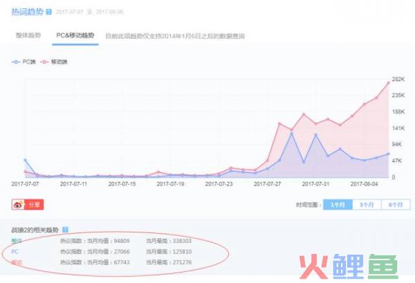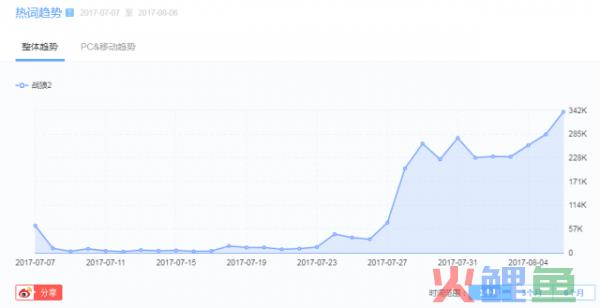 通过微指数近一个月的热词趋势,我们可以看出,战狼2的热度从7月27日,即“战狼2”的上映日开始成爆发式直线趋势飙升,自上映以来,大幅度飙升后,有小小幅度下降趋势,但又成上升趋势,并且热度值已达到342k,并且以图线趋势,还再不断上升。