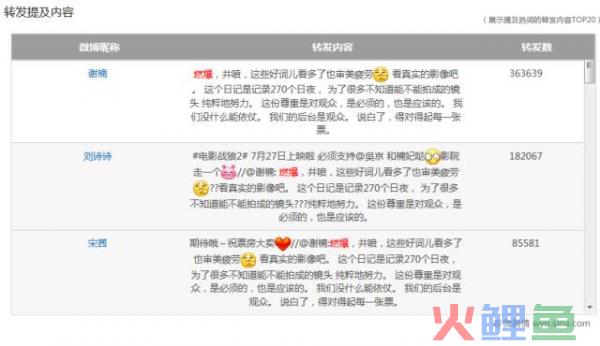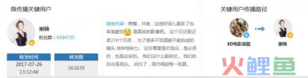 微博传播分析:基于该电影在微博的某条强大影响力和传播情况的分析,了解该条微博的传播规律,互动粉丝的画像,以及水军的辨识。