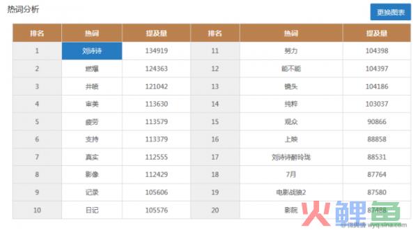 由此图表可以看出,有点好笑的是,“刘诗诗”这个词竟然是提及最多的(吴京会不会笑哭),由此可以看出,刘诗诗的影响力有点大啊,另外排名第二的热词是燃爆,嗯,看来“战狼2”确实很燃爆。