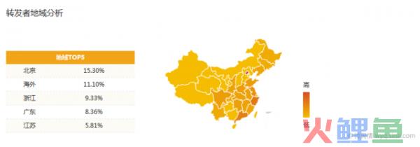 由上图可以看出转发者北京排第一,而第二名是海外,以11.10%占据第二,由此“战狼2”不但引起国内的巨大反响,最为剧烈的是海外的反响共鸣。评论者数以广州排名第一,想必跟上面讲到的吴京在广州路演的回应有很大关系。