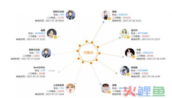 由以上传播节点图可以看出:吴京的老婆谢楠功不可没,转发次数和带动影响力最大,另外还有很多吴京好友的大V明星的互动转发,节点影响力扩散最为剧烈,如:戚薇、刘诗诗、赵丽颖吧等。