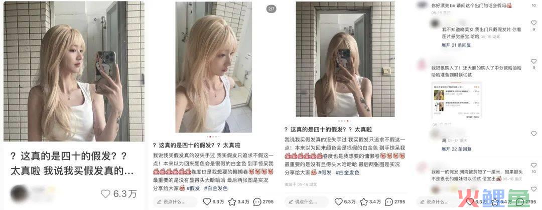 小红书爆文标题:标题引人了数字+结果的标题公式,“四十”、“太真”一下标明产品的性价比,让人好奇点进去看看这个假发是怎么逼真法?