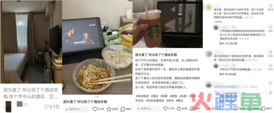 小红书爆文标题:标题运用了情绪词+解决方案的标题公式,以“累了、休假”的情绪词,引发用户共鸣,“酒店休假”引发了用户的好奇心,设置了悬念,会让读者想点击看看是怎么样的酒店,安利性强。
