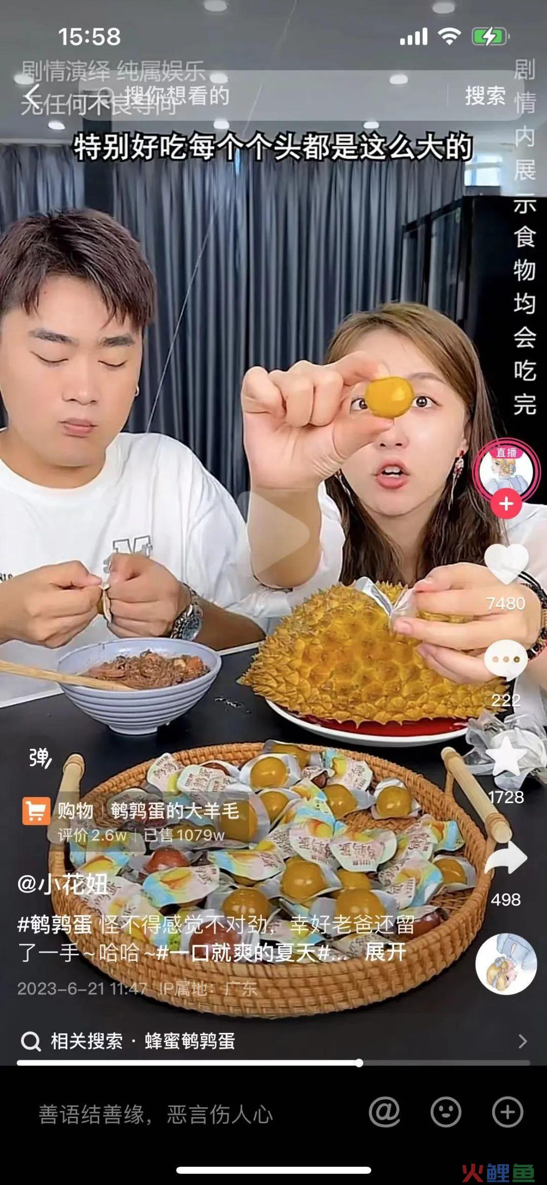 剧情设计一般带有达人本身的IP属性,结合达人常见的内容引入产品本身,例如@小花妞,平时会拍一些和老公抢食的剧情小视频,带货比比赞鹌鹑蛋的时候打造了吃早餐的场景,将比比赞的鹌鹑蛋融入剧情中,再恰到好处的凸显产品特点,并引导小黄车下单,一气呵成,一个视频销量5万-7.5万。