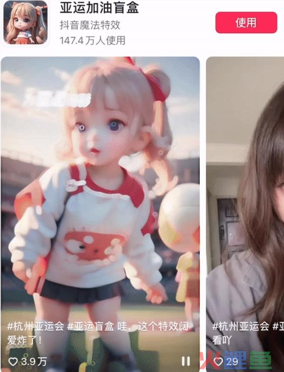 抖音官方在杭州亚运会期间推出了“亚运加油盲盒”AI特效,可以给用户照片添加卡通化的亚运造型,已有超过147万人使用。