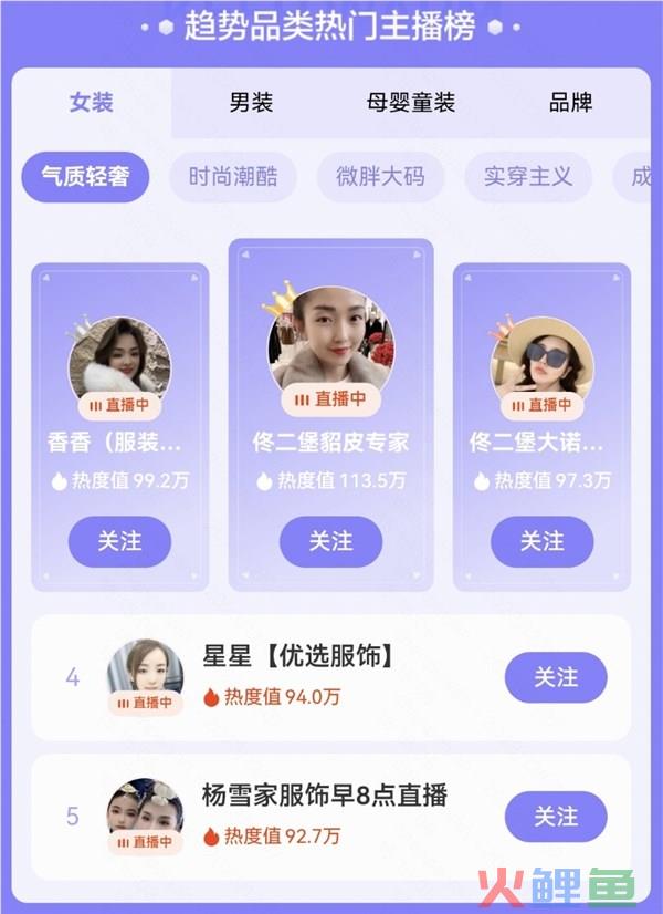 不仅设有品类榜 单,还有“趋势品类热门主播榜”,各风格类目直播当天成交金额及消耗TOP5 的商家即可上榜,优质商家可获得主会场最核心位置。这样的运营及设计,能够让优质商家被更多消费者“看见”,也能让消费者购买到更多高性价比好物。