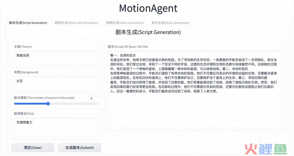 用户只需输入创意描述,MotionAgent即可自动生成剧本、剧照、视频和音乐。