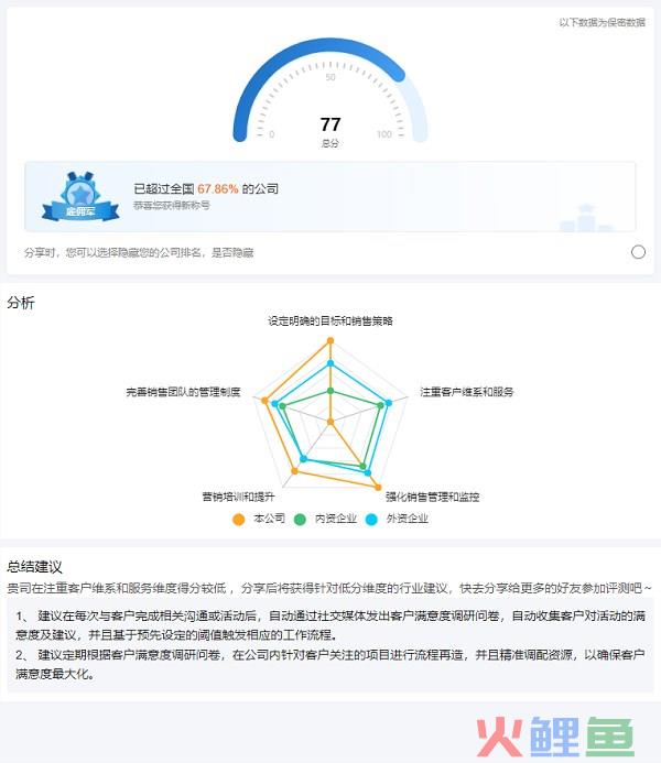 通过问卷,客户清晰得知目前企业销售运营体系成熟度得分与排名,以及深刻了解整个体系中自己企业最欠缺部分。整个问卷排布实际是一套从零开始搭建可量化、可优化的销售运营体系,展现了建立强大销售组织的范例。销售不再是艺术,而是可衡量的公式。