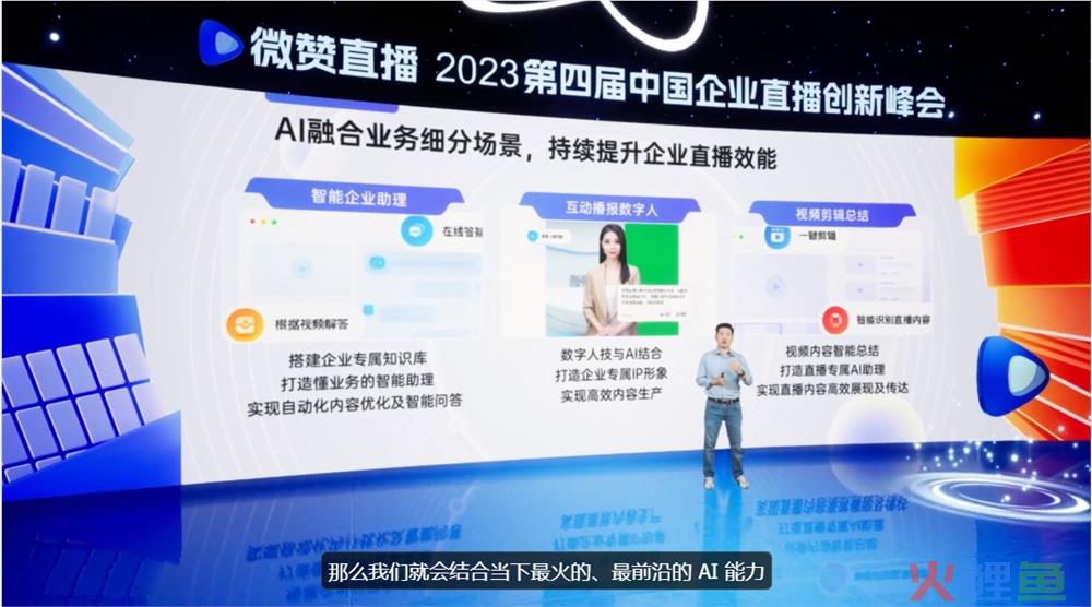 微赞副总裁何祖恒基于AI+私域融合给出了答案。他指出AI是一场效率革命,微赞直播很多应用都已经跟AI深度结合。像“播报数字人+智能剪辑+AI助手”的私域直播解决方案,让AI一键融合业务场景,打造有效率、低成本的内容制作引擎,有效提升企业直播效能。