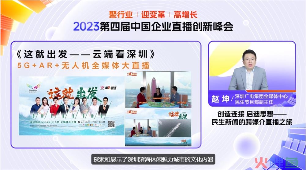 “融媒体+直播”跨界中深圳广电调整战略,新闻之外还开拓了多元业务范围,将文旅、教育、政务、企服、大健康等垂类领域内容,以直播为连接纽带,打造全媒体格局和多个爆款视频IP,牢牢把握住地方媒体流量密码,实现媒体平台影响力最 大化。