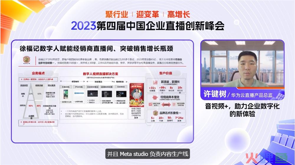 多元化新媒体时代,内容已成为捕获消费者注意力的关键。华为云直播产品总监许键树分享到,基于华云 Meta studio 数字内容生产线,通过云渲染及数字人能力,赋能行业直播场景由“真人实拍”走向“AI数字人,带来数字化虚实融合新体验,正助力企业在AI时代构筑更强的内容生产力。