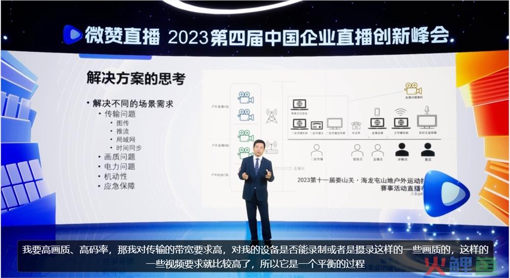 与内景直播不同,户外环境因素影响下运动赛事直播对技术、设备有着更高要求,譬如无线传输、音画质的稳定性。作为专业直播执行服务从业者,贵州三言文化户外文体赛事直播总监于庆阳分享了自己对无线网络环境下户外直播项目的思考和技术解决方案。其中就包括微赞的芯象帧同步技术,通过直播背包+5G帧同步导播软件,高性价比解决多机位互动、导播时回传和画面同步的问题。
