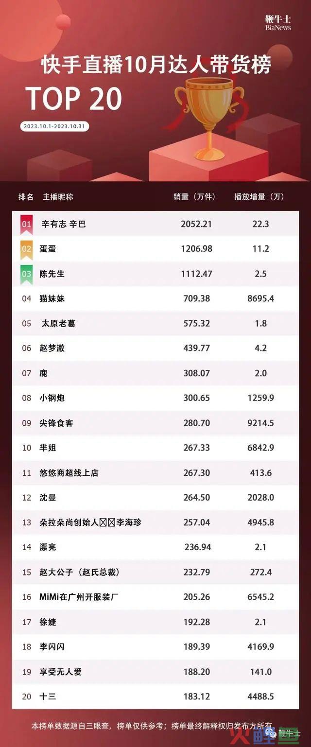此外,疯狂小杨哥、辛巴等头部主播,虽然已经成立了公司,进入矩阵化直播阶段,但其本人依然保持着强劲的带货能力。辛巴甚至不久前登上了快手带货月榜榜首,销量高达2000多万。