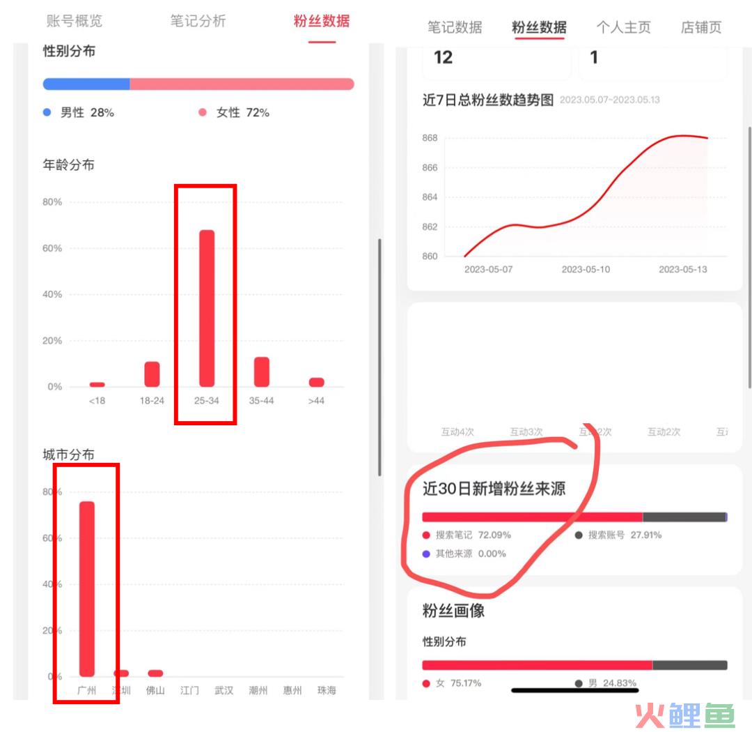 如下图,做好账号精准定位+图文内容垂直丰富度后,用户年龄、地区也会聚焦成你想要的目标群体,而新增粉丝来源搜索流量,也会一定程度带来更多推荐流量。