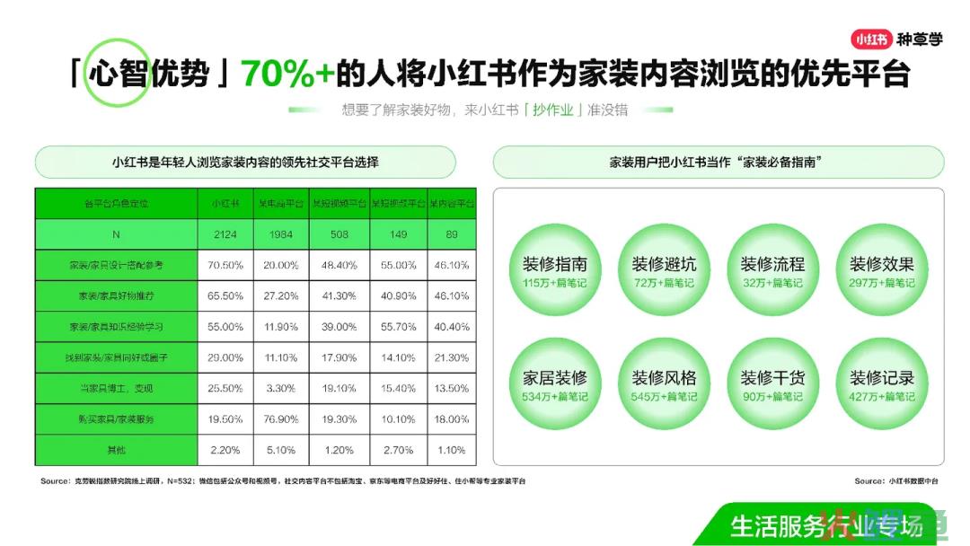 在克劳锐指数研究院一项关于社交内容平台的线上调研中,将小红书作为家装内容浏览优先平台的人就占到了70%+,其中意向购买家装服务的精准人群占比19.5%。纵观用户搜索和浏览全链路,小红书已成为家装用户的百科全书,可见心智优势。