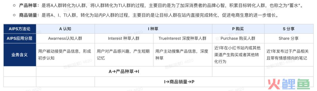 AIPS模型是小红书的人群模型,也就是认知人群——种草人群——深度种草人群——购买人群——分享人群。