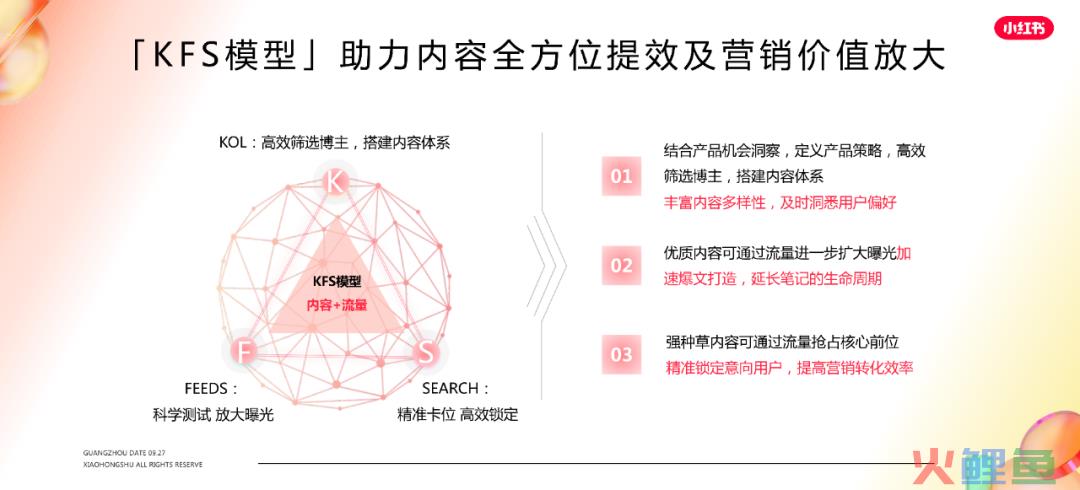 KFS内容营销组合模型,由小红书灵感营销推出,即Kol(创作者)优质内容引爆+ Feeds(信息流广告)精准触达提效+ Search(搜索广告)强化搜索拦截的核心策略组合。