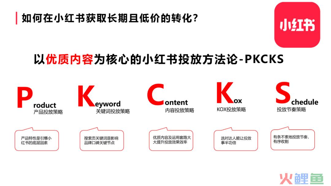 PKCKS模型是小红书官方提出的广告投放方法论,包括Product:产品投放策略、Keyword:关键词投放策略、Content:内容投放策略、Kox:KOX投放策略、Schedule:投放节奏策略。