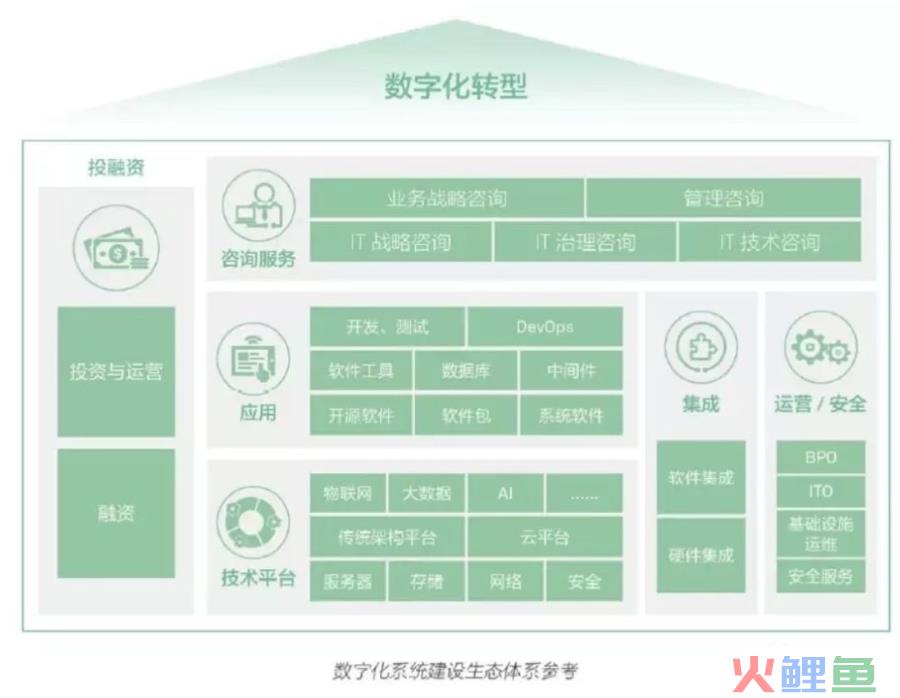 数字化系统建设所需的生态合作资源,通常包括咨询设计服务,应用服务,技术平台服务,系统集成服务,运营安全服务和投融资服务等。