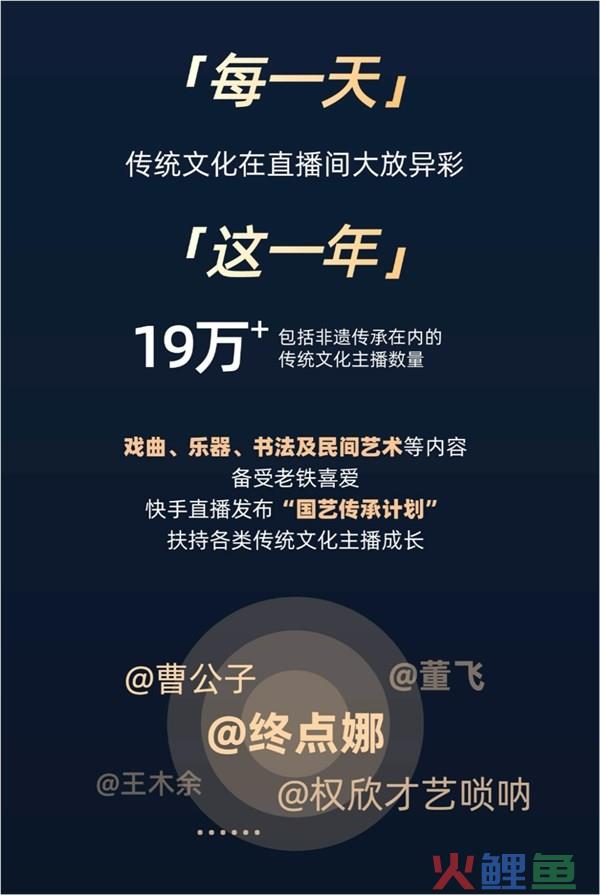 为了助力传统文化获得更加长远的发展,快手直播今年还发布「国艺传承计划」,为国艺传承人提供一个面向更多元大众的窗口,并借助平台资源,扶持了@曹公子、@终点娜、@董飞、@王木余、@权欣才艺唢呐 等众多传统文化主播的成长,助力传统文化内容在直播这片沃土上快速成长、创新传承。