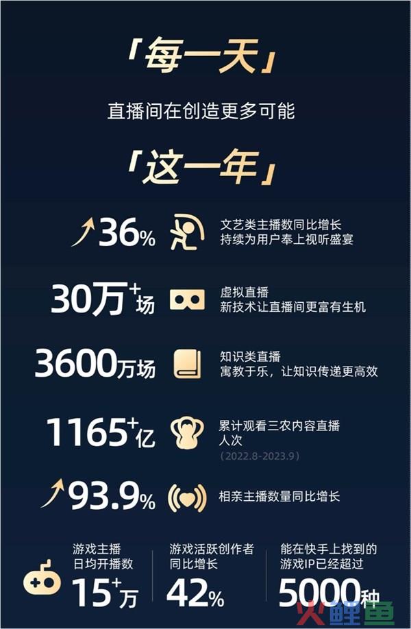 同时,快手 2023 年举办了知识类直播 3600 万场,包括《新知如师说》等名师栏目,通过寓教于乐的方式,实现了知识的更有效传递。而在 2022 年 8 月至 2023 年 9 月期间,快手平台累计观看三农内容直播人次超过 1165 亿次,为乡村振兴大业提供了新助力。