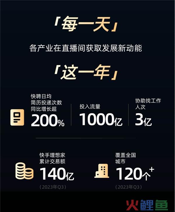 数据显示,快聘日均简历投递次数同比增长超过200%,流量投入达到 1000 亿,协助找工作人次达 3 亿;而在房地产领域,快手理想家专业赋能更多房产经纪人转型主播,以新型房产经纪模式,可以加速买房人群、房产主播、房企和机构之间的链接,第三季度理想家累计交易额 140 亿。