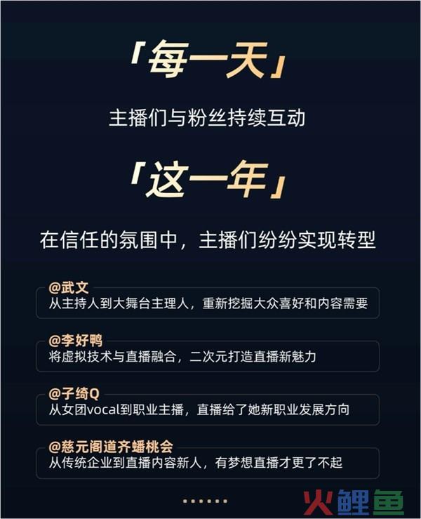 和用户粉丝保持高频互动,是持续拉近主播与粉丝距离,增加信任感的重要方式。而在粉丝们的信任和支持下,主播们也纷纷开启转型之路,创造无限可能。其中主持人@武文 登上快手直播大舞台,重新挖掘大众喜好和内容需求,为民众带来更多精彩的文化盛宴;@李好鸭 将虚拟技术与直播融合,带来诸多具有创意的内容,打造出二次元直播的新魅力;@子绮Q 则从女团vocal转型为职业主播,为自己开辟了新的职业发展方向,也为更多娱乐圈领域的从业者打开发展思路;@慈元阁道齐蟠桃会 从传统企业转型成为新晋直播内容创作者,打造出独具特色的IP直播内容,更展现出梦想直播的不凡魅力。