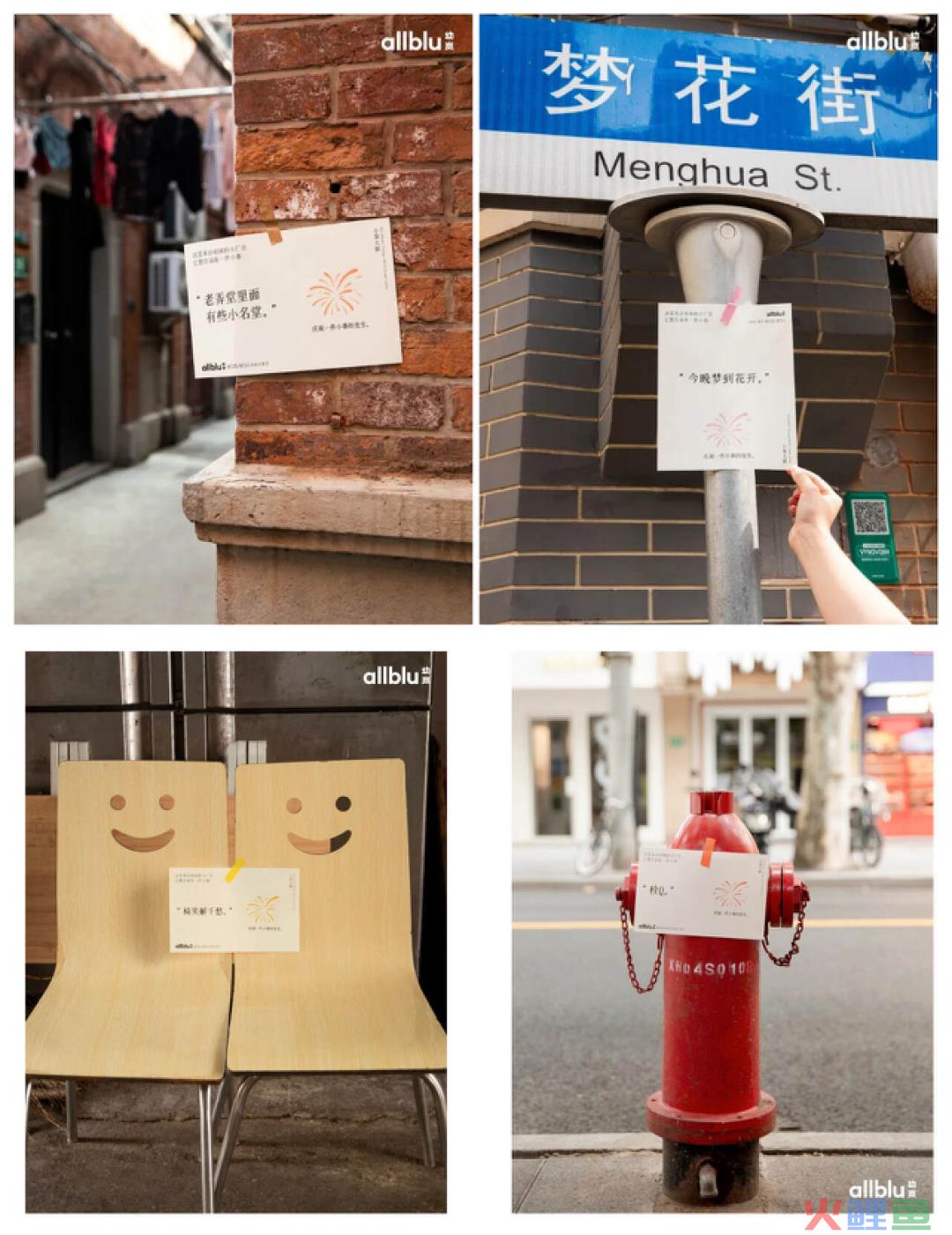 这些文案以小卡片的形式,被张贴在大街小巷、商铺住宅,甚至你一直忽视的消防栓上,也有各种路标、邮箱、电瓶车上。一句句听起来平常的文案,和街头结合在一起,就变成了值得打卡的场景。