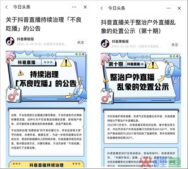与此同时,在直播健康分这样的主播管理机制之外,抖音还推出了一系列专项整治措施。针对户外直播乱象、不良直播PK、低俗擦边内容,以及吃播违规行为等多种不良直播行为和劣质直播内容进行持续整治,并通过抖音黑板报定期对外公示专项治理结果。