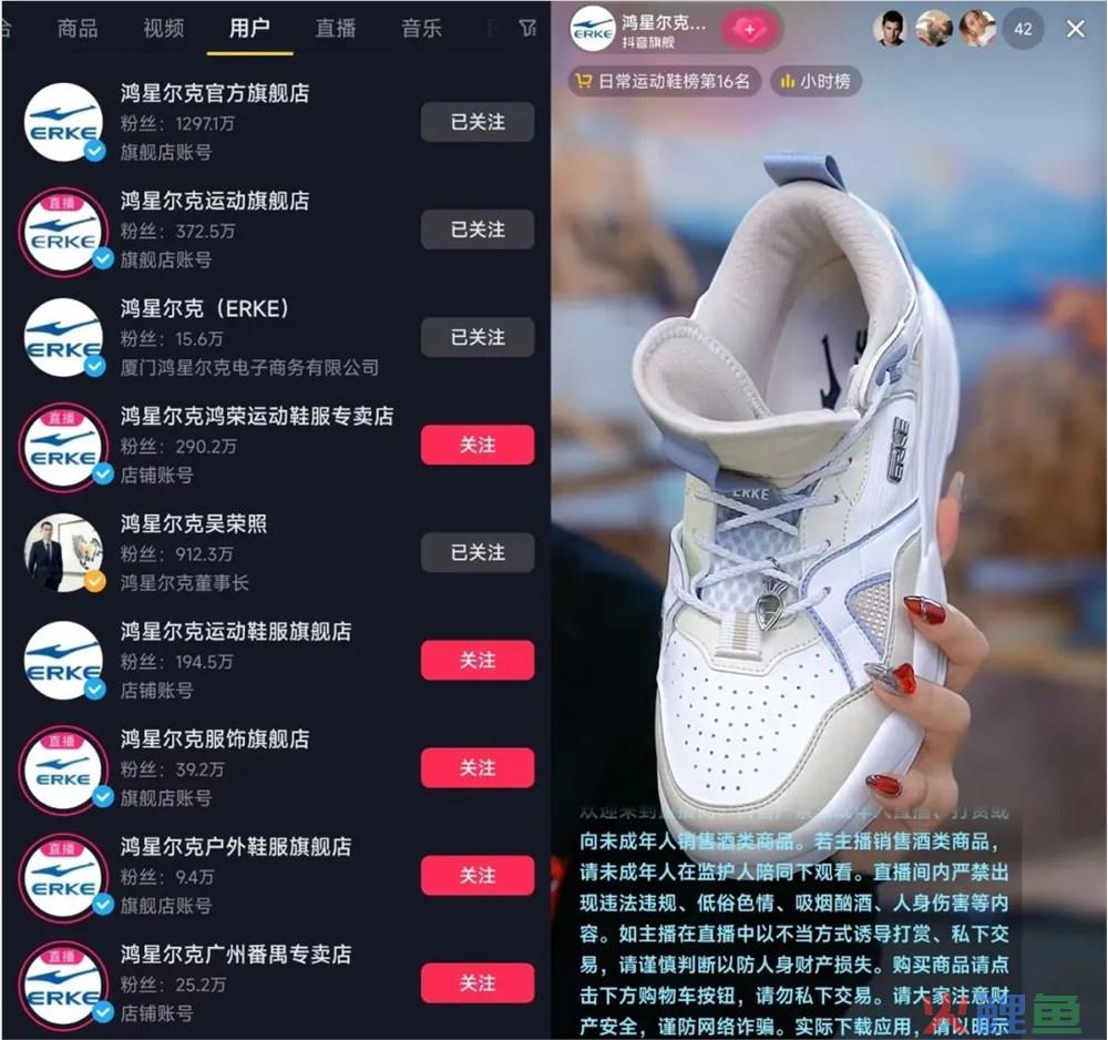 以鸿星尔克为例,2021年爆火后,为了承接住野性消费的流量,鸿星尔克加速布局了矩阵账号。截至发稿前,鸿星尔克在抖音至少有74个蓝V账号,其中千万粉账号1个,百万粉4个。此外,鸿星尔克董事长吴荣熙的抖音账号粉丝数也高达912万。