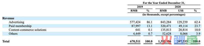 根据知乎招股书显示,知乎2020年总营收为13.52亿元,主要收入都来自线上广告业务,占总营收62.4%。同主流的内容社区相同,知乎也面临着收入来源依赖在线广告的尴尬。
