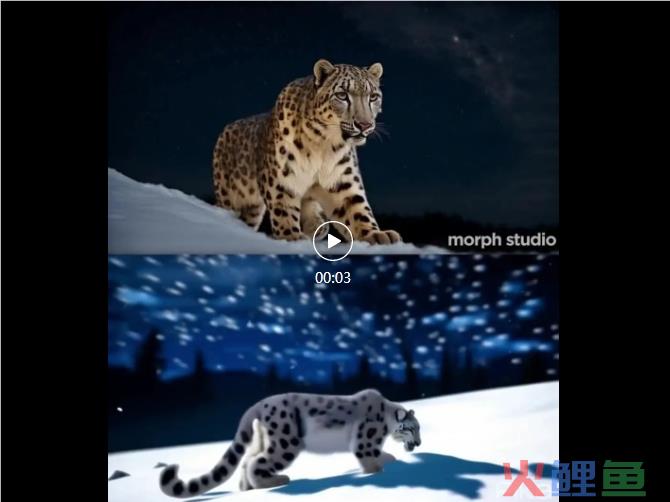 Morph Studio 的答卷,文本理解准确。1080P 画面中,雪豹毛发细节丰富,栩栩如生。背景中可以看到银河和星星。不过雪豹走动幅度不明显。