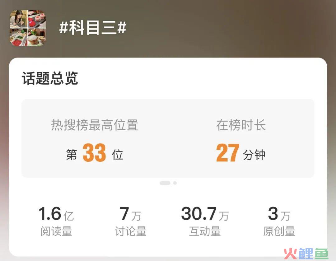 据统计,在微博上,「科目三」单个话题的相关阅读累计达到了1.6亿,互动量为30.7万,产生了3万+篇原创内容。