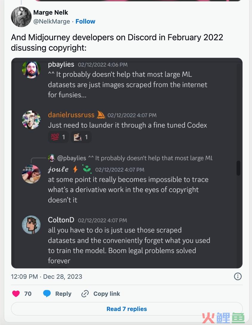 更糟糕的是,Marcus 发现有证据表明 Midjourney 的一名高级软件工程师在2022年2月参与了一场关于如何通过「通过微调代码」来「洗白」数据以逃避版权法的对话。