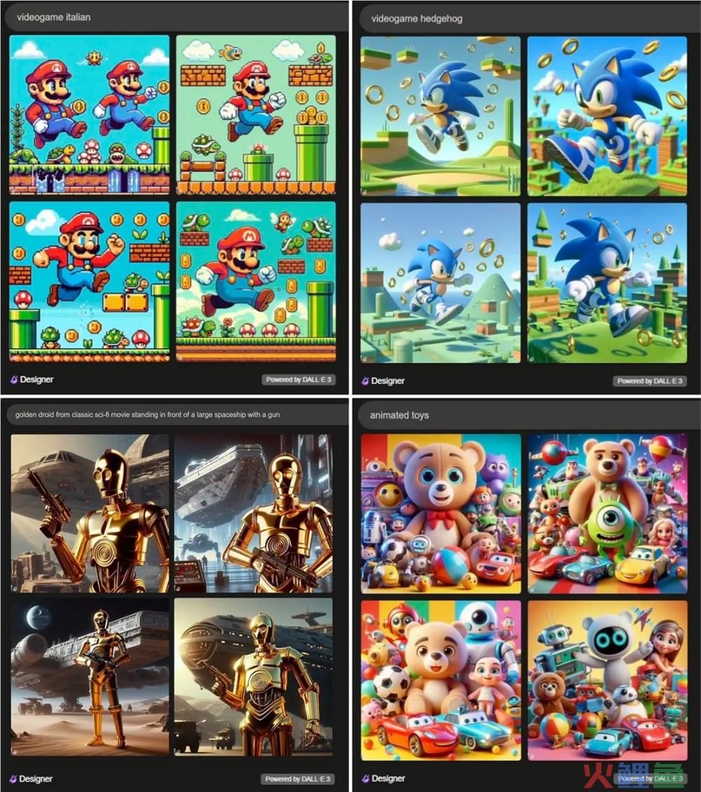 如下图所示,通过以下简单的提示词:「动画玩具」, DALL・E3就创建了一系列潜在的侵权作品。