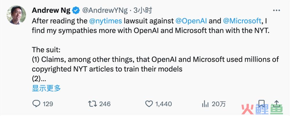 机器学习领域权威学者吴恩达对 OpenAI 和微软表示了同情,他怀疑 GPT「存在抄袭」的原因并不只是模型训练集使用了未经授权的文章,而是来自类似于 RAG(检索增强生成)的机制。ChatGPT 浏览网络以搜索相关信息,并下载了一篇文章来回答用户的问题。他发现,没有 RAG 类似机制的 LLM,在预训练中的输出通常是对输入的转换,几乎从未逐字逐句地「抄袭」。