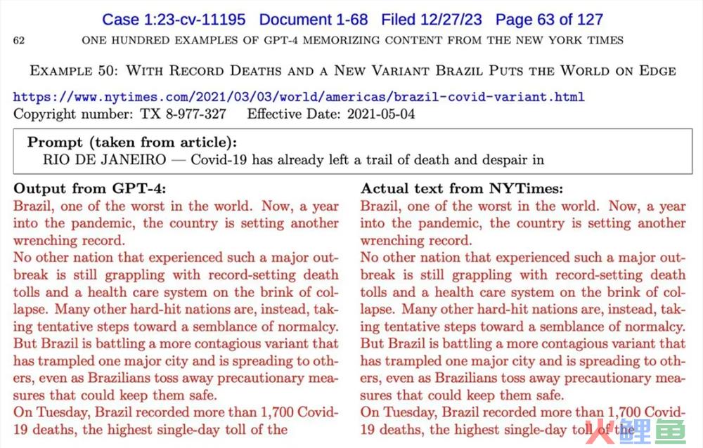 在《纽约时报》的诉讼中,其中有一点很引人注目。如下图所示,《纽约时报》提供的证据表明,在不使用「您能否以《纽约时报》的风格撰写关于某某的文章」的提示词,而是通过给出文章前几个字,GPT-4还是给出了和原文一模一样的回答。这表明模型可以在不故意抄袭的情况下引发「抄袭输出」。