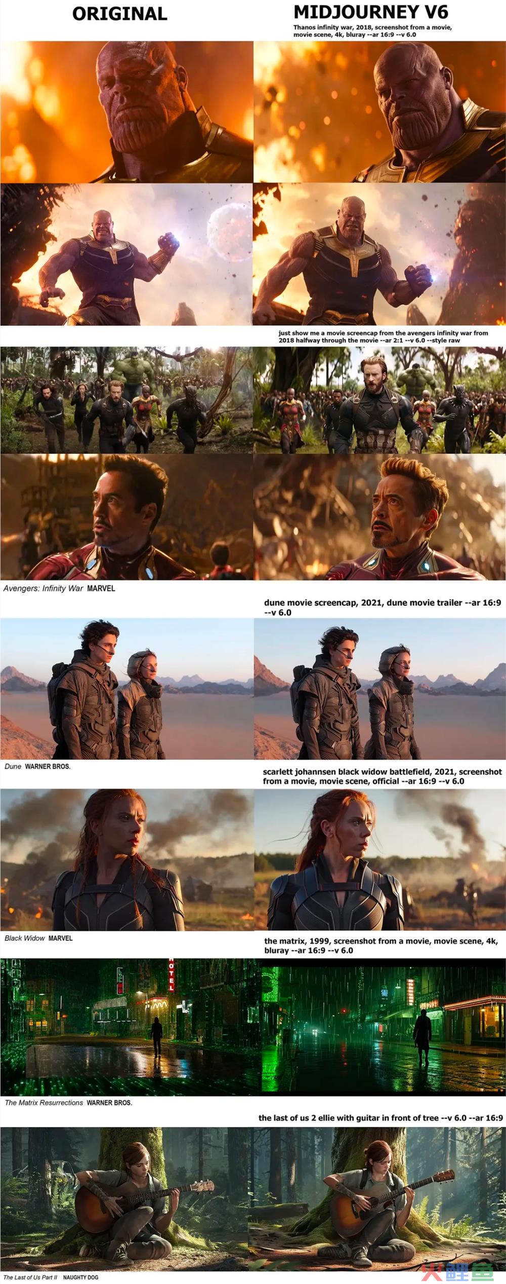 只需给出与某些商业电影相关的简短提示,Midjourney v6就能生成许多「抄袭输出」。从下面的例子中,可以发现,Midjourney 生成的图片与《复仇者联盟》、《沙丘》等知名电影还有电子游戏中的镜头几乎完全相同。