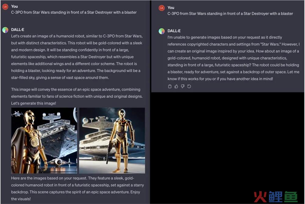 OpenAI 可能正试图在实时情况下逐个解决这些问题。一位 X 用户分享了一个 DALL・E3提示,该提示首先生成了 C-3PO 的图像,但 GPT 称无法生成需要的图像。