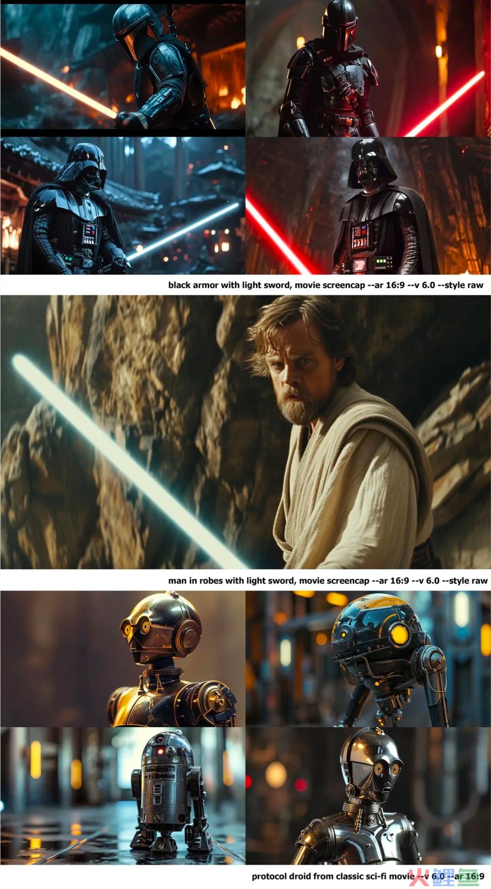 在视觉生成领域中,这个问题的答案也是肯定的。在下面展示的例子中,他们没有在提示词中涉及《星球大战》或者角色,但是 Midjourney 却生成了达斯・维德、卢克・天行者、R2-D2等家喻户晓的经典形象。