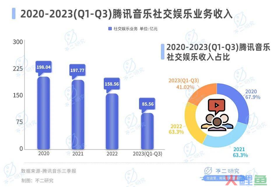 与此同时,社交娱乐服务业务曾是腾讯音乐的营收支柱,但2021年Q3逐渐减少,以2023年三季度为例,其社交娱乐服务业务收入为85.56亿元,同比下降48.8%。