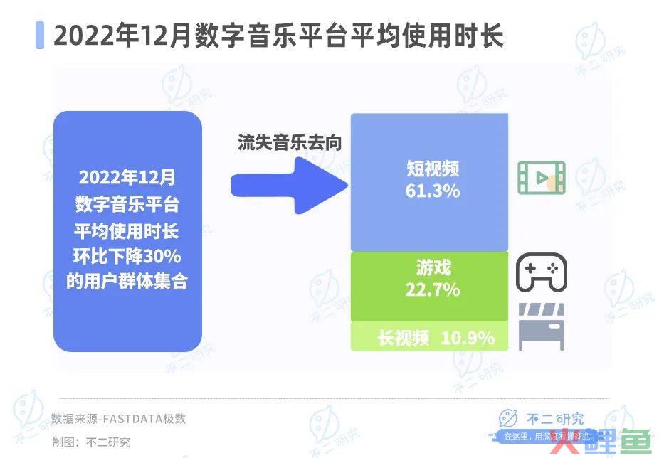 Fastdata极数发布的《2022年中国在线音乐行业报告》显示,2022年12月,数字音乐平台平均使用时长环比下降30%的用户群体,同一时间段内使用抖快短视频平台的时长环比增幅达61.3%。短视频对用户碎片时间的侵吞可见一斑。