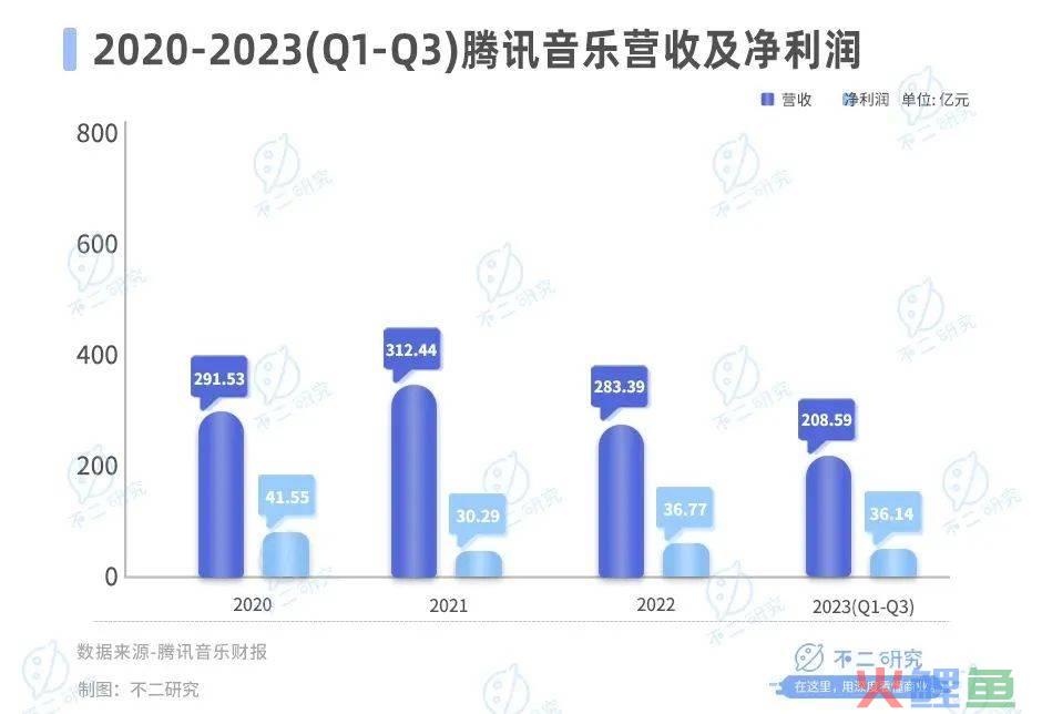 「不二研究」据腾讯音乐三季报发现:2023年前三季度,腾讯音乐营收为208.59亿元,同比减少0.26%;同期,净利润为12.6亿元,同比增加15.6%。