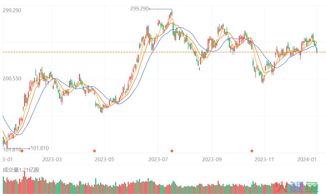 不过,让比亚迪尴尬的是,虽然销量涨了一年,但股价却跌了一年。其2023年2月股价达到全年最高的304.99元/股,但随后开始下跌,至12月股价出现全年最低的182.85元/股。截至1月4日,比亚迪股价微跌0.08%,收盘价193.02元/股。
