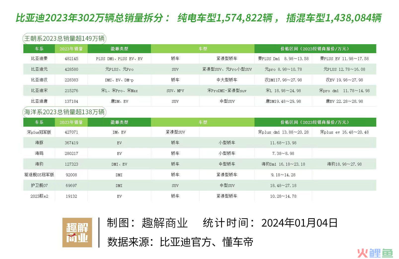 比亚迪(002594.SZ)超302万辆新能源车的销量,不仅实现了王传福年初定下的目标,还在第四季度纯电车交付量上超越特斯拉,成为全球纯电汽车的季度销冠。
